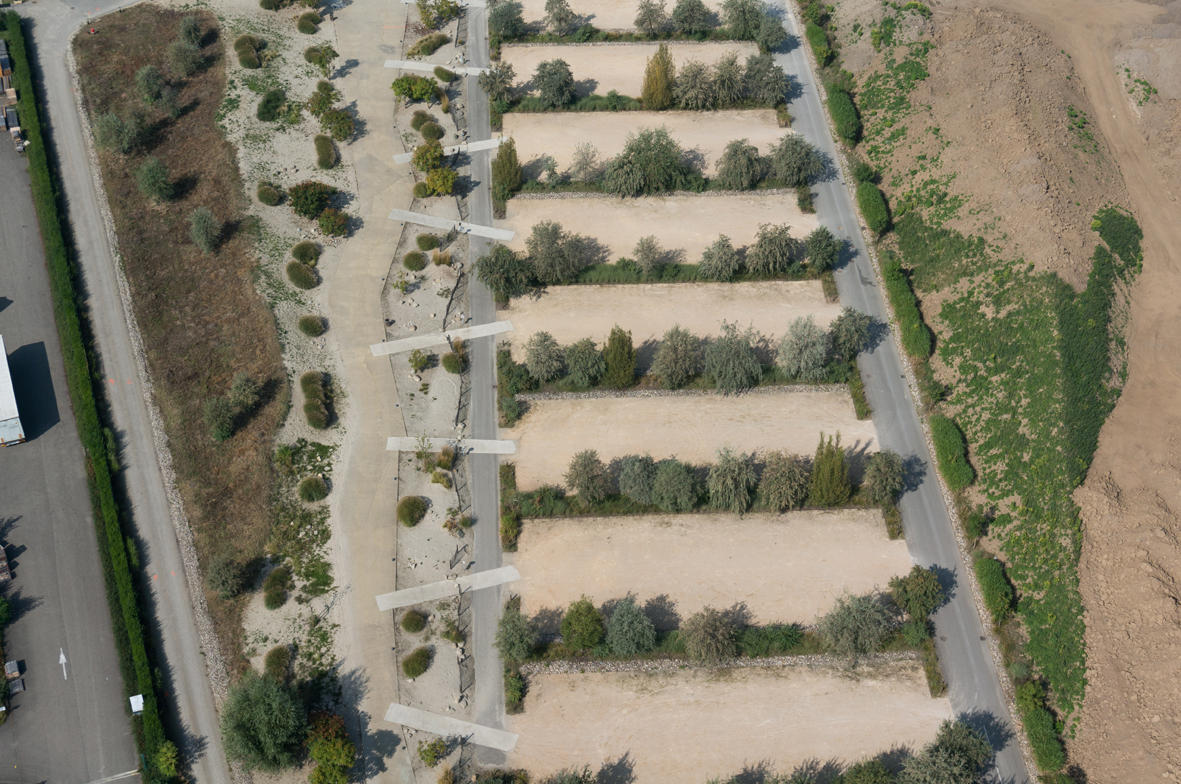 Un alignement d’arbres fort et affirmé sur lequel s’appuie l’espace d’accueil permet de créer un point d’appel, un élan à l’échelle du grand paysage. Cet alignement marque de façon claire l’entrée des véhicules pour une distribution sur les loges végétales (zones de stationnement).