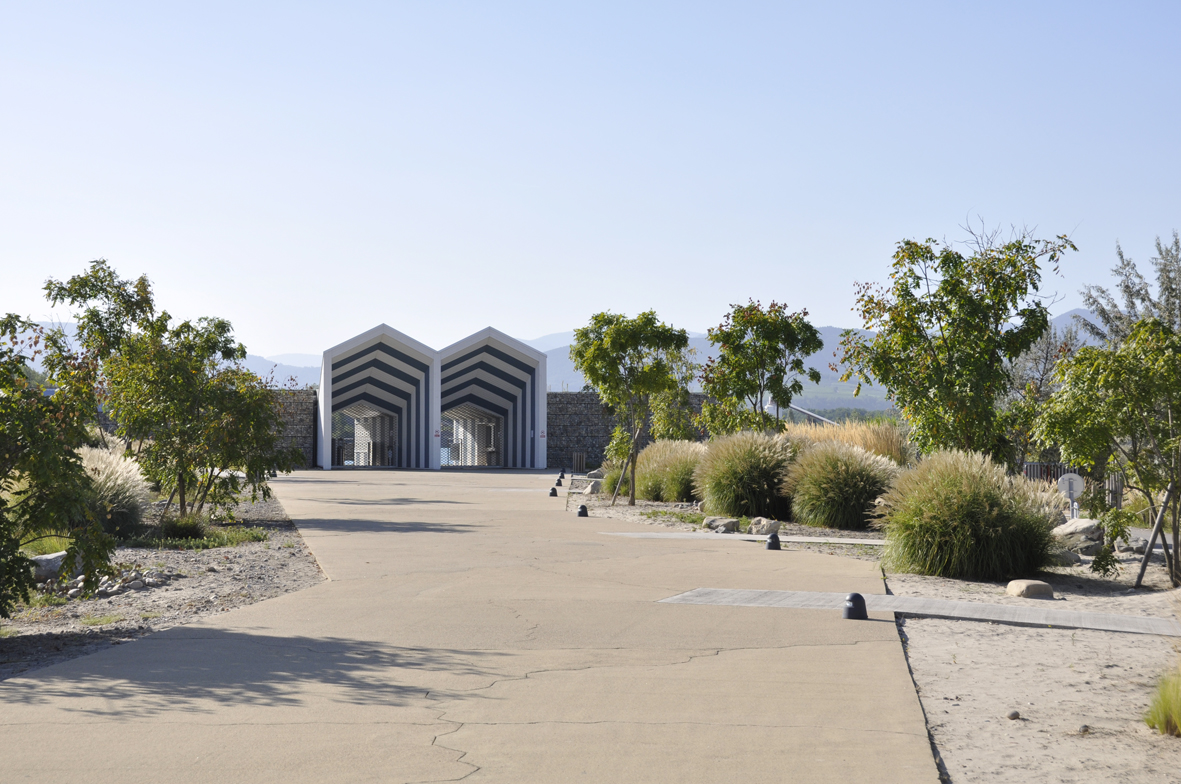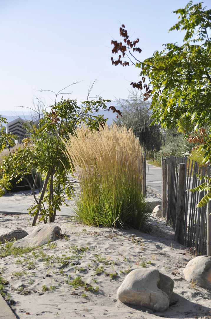 Le visiteur est incité à rejoindre l’axe piéton principal sous un couvert végétal clairsemé dont la silhouette rappelle les pins parasol et accompagné par une ambiance volontairement aride vers la plage.