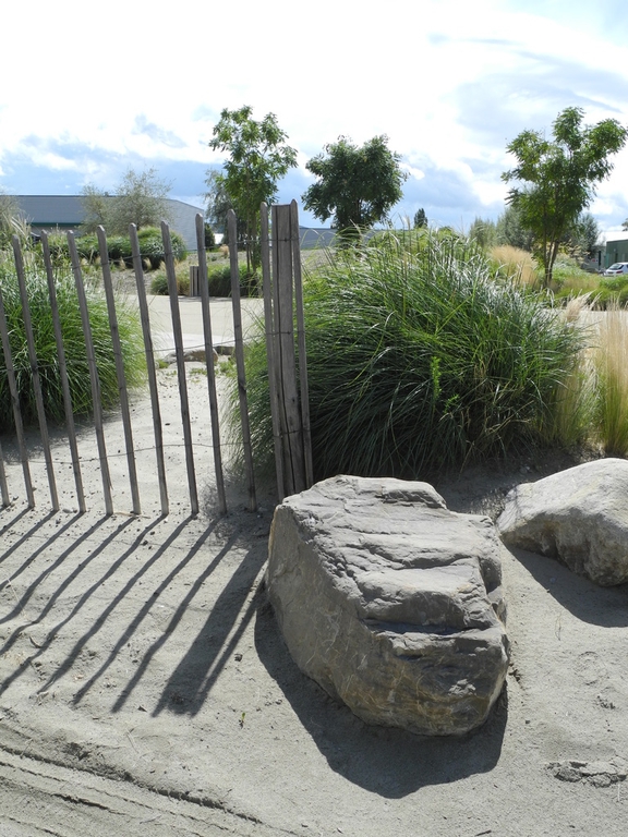 Cet axe piéton traité en béton désactivé aux joints volontairement faïencés, stabilisé et galets de part et d’autre s’agrémente ici et là de quelques touffes de graminées sur merlons secs sous le couvert végétal clairsemé. Cette entité paysagère affirmée accompagne progressivement le visiteur vers un ‘’passage’’ : l’entrée sur la plage.