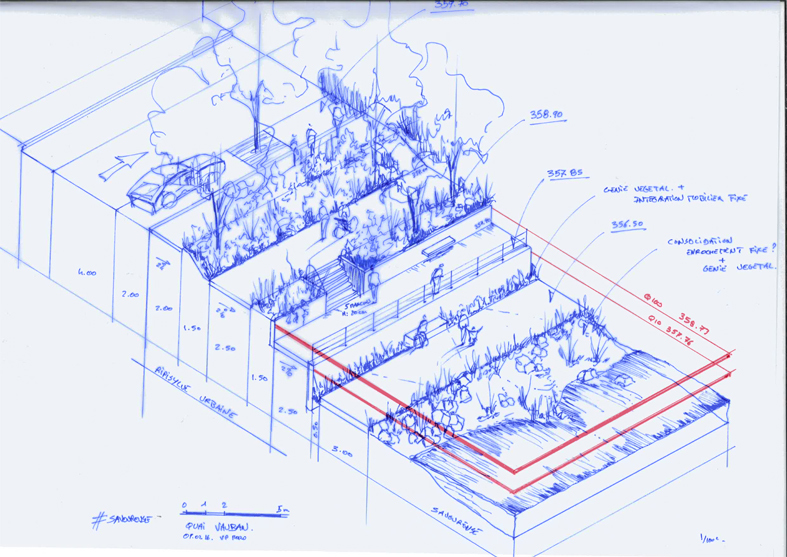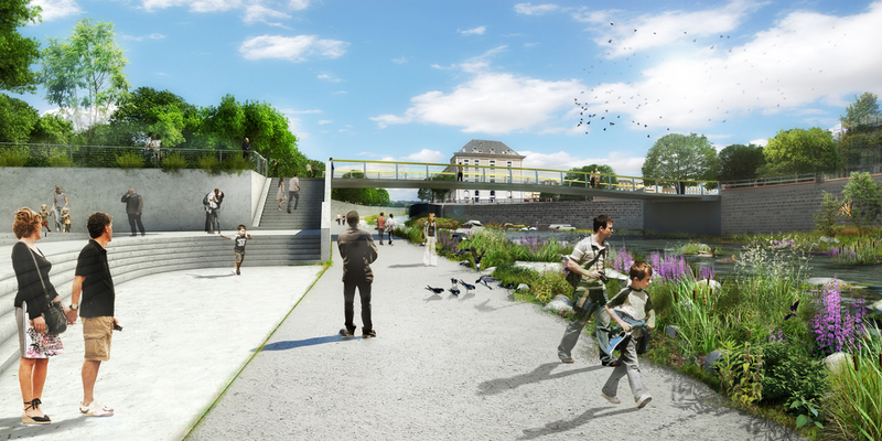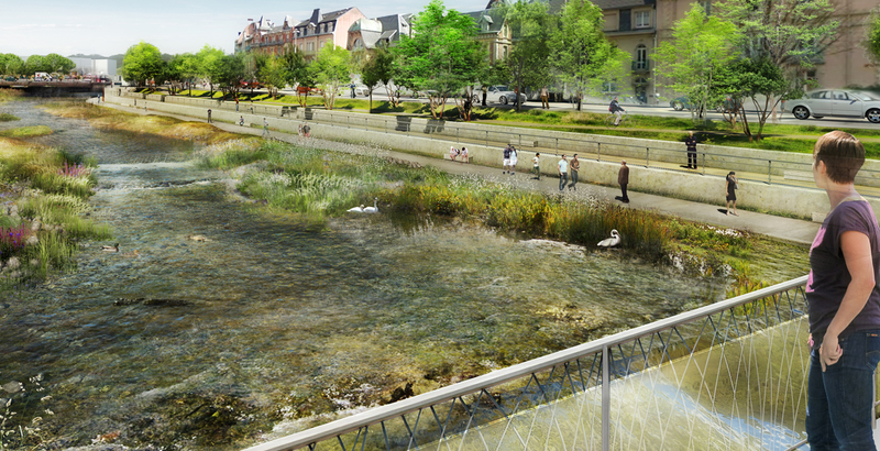 Le cours d’eau ‘irrigue’ littéralement les espaces publics qui s’appuient sur ses flancs. Flancs tantôt ouverts à la vue, tantôts accessibles pour mieux contempler la rivière et la parcourir en son cœur.