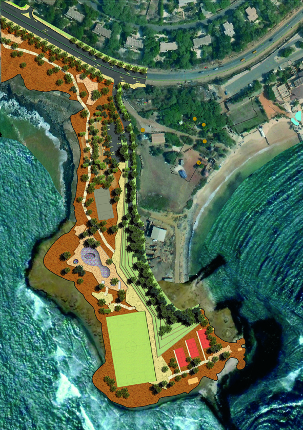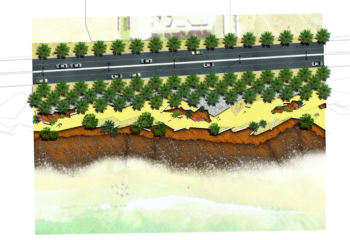 Si les lignes du revêtement côté ville sont régulières, celles côté corniche se composent de lignes brisées. En fonction des séquences, l’alignement de cocotiers côté mer s’enrichi d’un deuxième ou d’un troisième alignement qui peut ici et là être complété par une végétation plus diffuse et aléatoire, propre au littoral. Dans le cas d’un double et d’un triple alignement, celui-ci est planté en quinconce de façon à offrir aux automobilistes des perspectives en diagonale : ouverture visuelle sur l’océan.