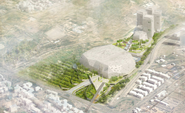 Situé au Nord de la ville de Téhéran, le quartier de Larak s’étend sur les premières pentes d’une chaine de montagne désertique. Sur un site aux confins de la ville et de la montagne, en lieu et place de parcelles de verger, un programme immobilier de plus de 800 000 m² est programmé. Il doit rassembler un centre commercial et culturel, des équipements sportifs des bureaux, un hôtel de luxe, un parc…