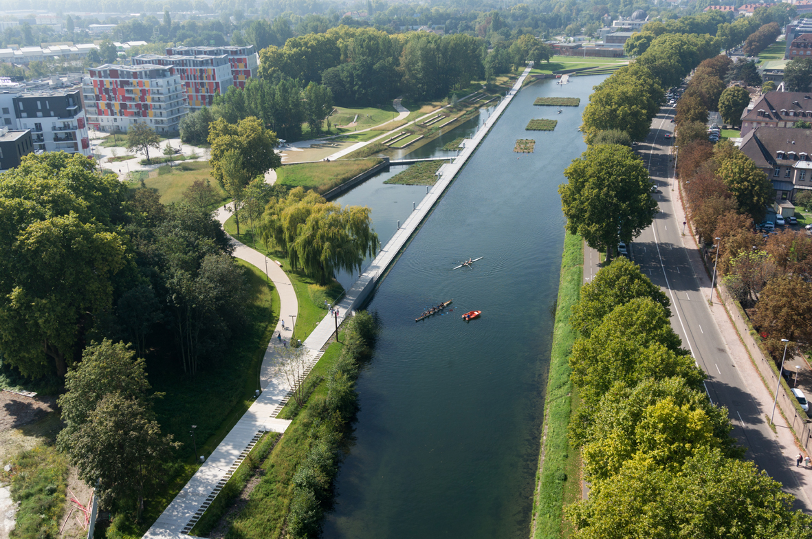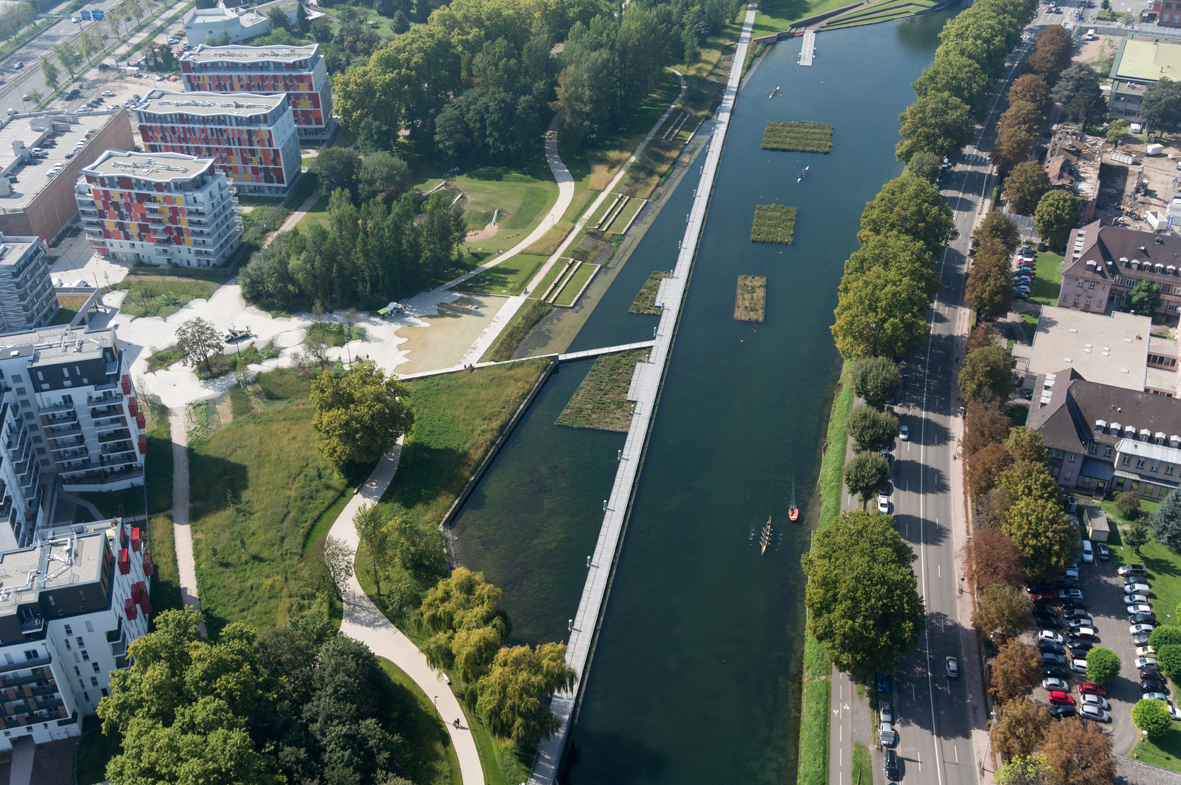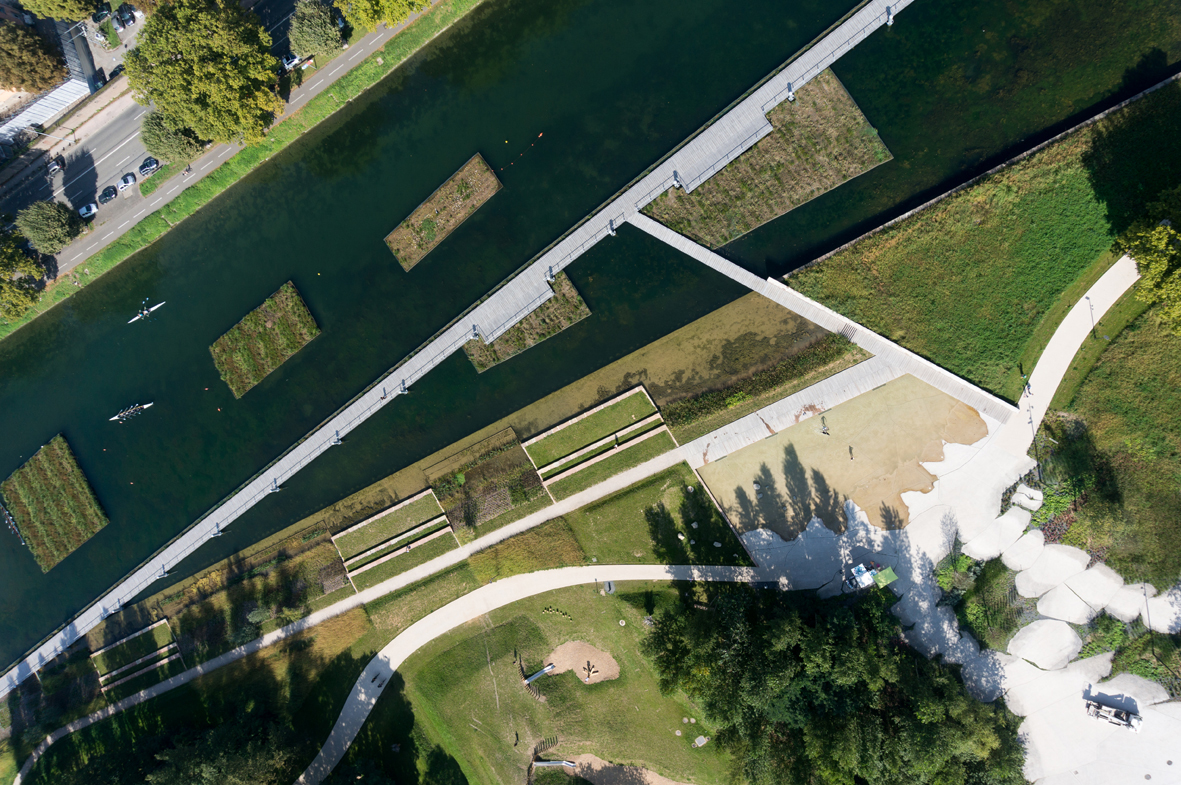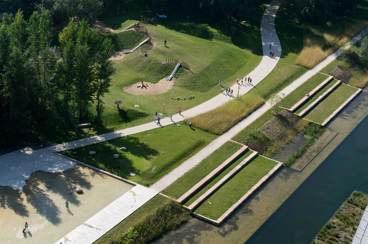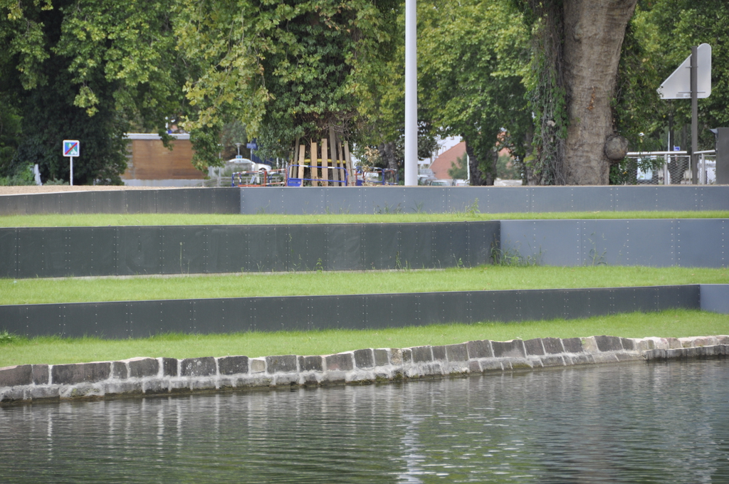 Un amphithéâtre de verdure pourra accueillir les spectateurs des manifestations sportives se déroulant sur le bassin : matchs de kayak-polo ou compétitions d’aviron.