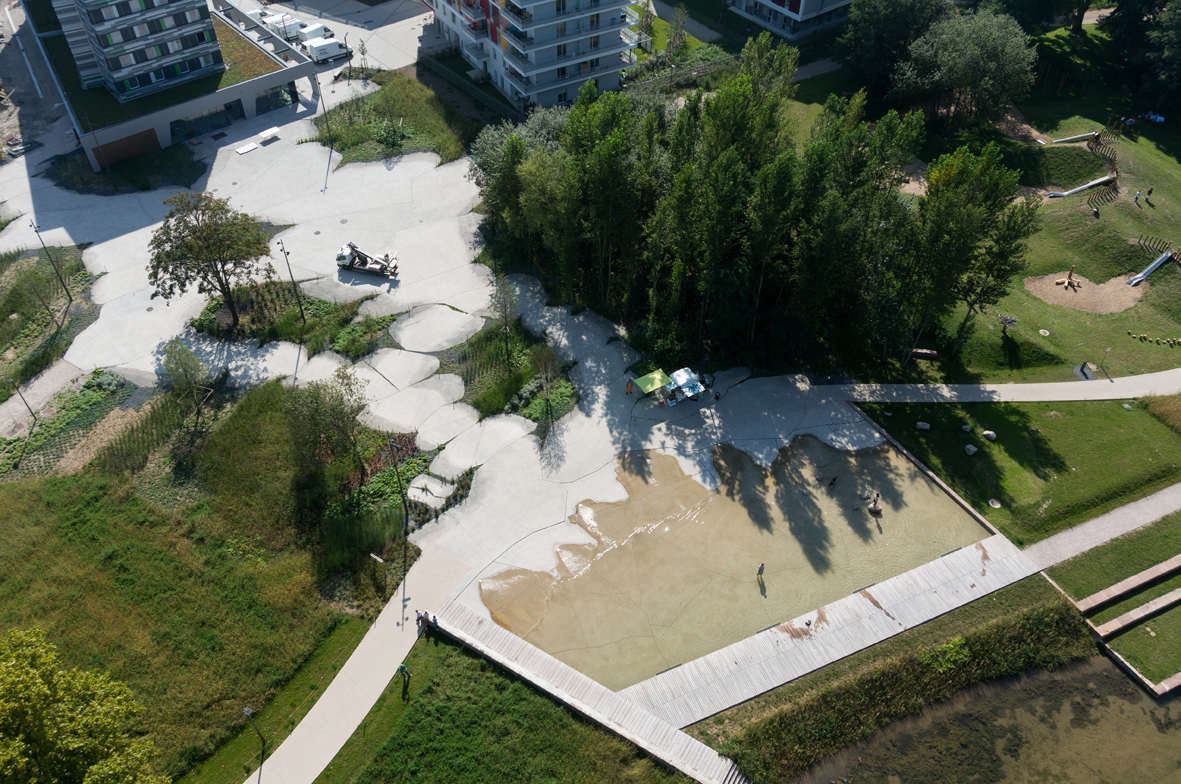 La placette, à configuration plutôt minérale, est également animée par des jeux d’eau. L’eau vive redescend jusqu’au bassin en ménageant des pauses, créant ainsi de nombreux écosystèmes.